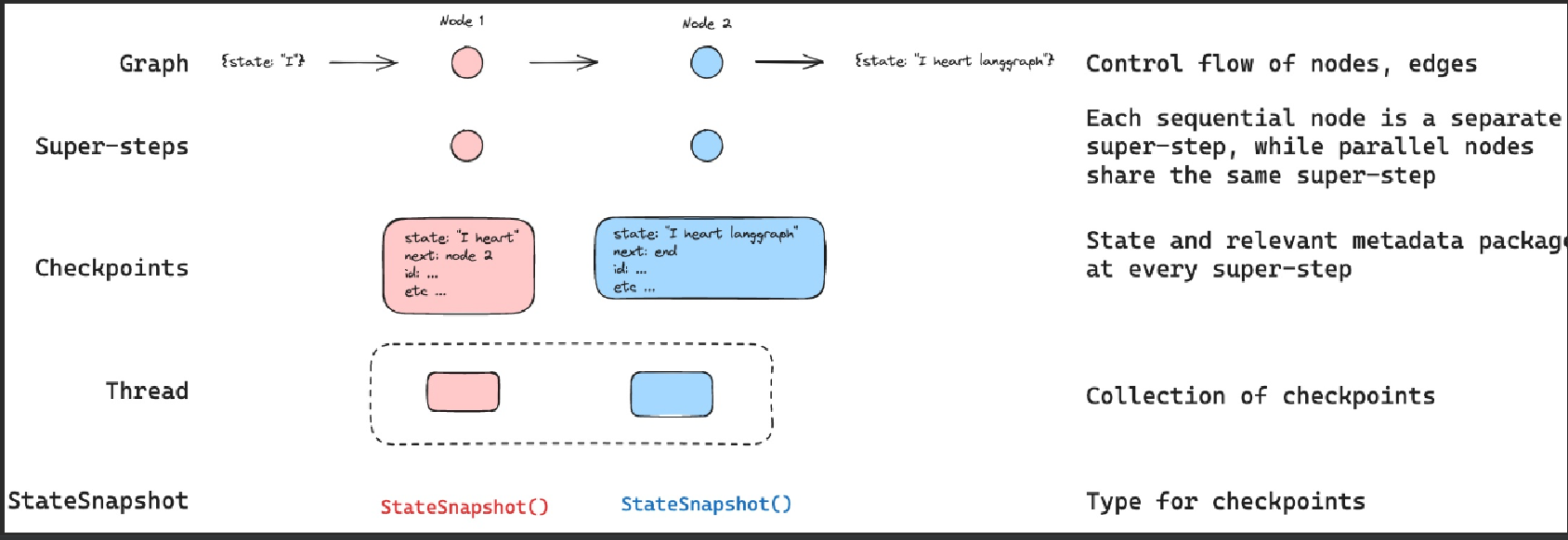 LangGraph 框架有一个内置的持久层,通过checkpointer实现。当使用checkpointer编译图时,检查点会在每个超级步骤中保存图状态的checkpoint。这些checkpoint被保存到一个thread中,可以在图执行后访问。如下图所示: